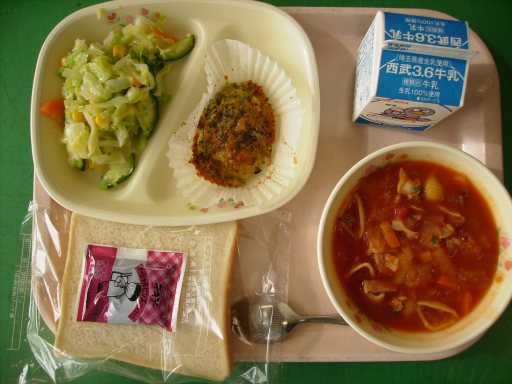 今日は、秋の味覚の代表、さつまいもをミネストローネに 入れました。さつまいもの甘みが、酸味を和らげて 児童にも好評でした。残りはほとんどなし。 マカロニは貝の形のコンキリエを使いました。