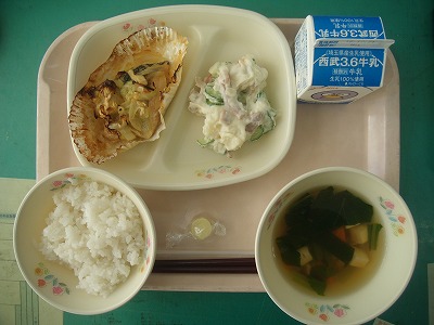 12月14日(金)の給食☆本日の献立☆ ご飯、チャンチャン焼き、ポテトサラダ、すまし汁、チーズ サケのチャンチャン焼きは、確か北海道の郷土料理だったと思います。イメージは、サケの半身にみそなどをぬって、豪快に焼き、みんなでつついて食べている雰囲気です。給食も、みそ味がきいていて、おいしかったです。 |