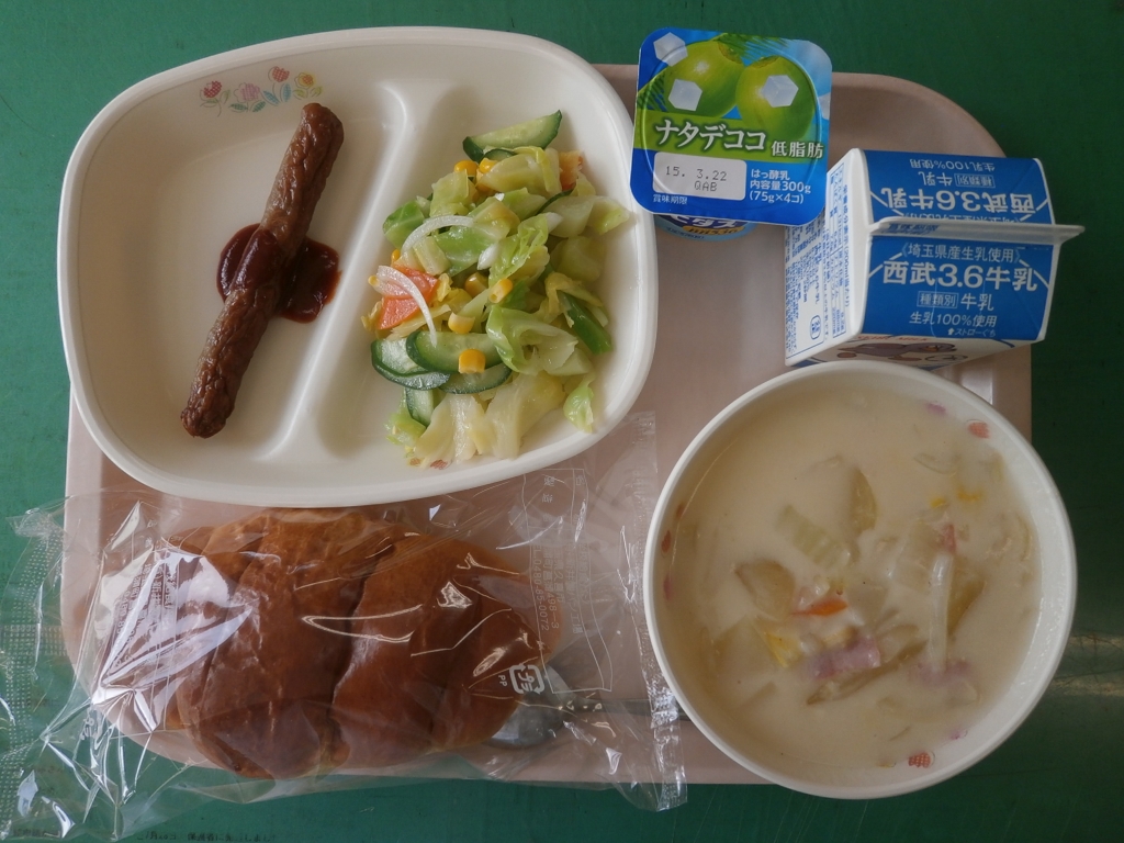 今日はコッペパンスライスを変更して、バターロールにしました。 ウィンナーを挟んで食べてたり、クラムチャウダーに「つけパン」を して食べたりと楽しみました。サラダも、さっぱりとしていました。 ヨーグルトはナタデココ入りのものを注文しました。 今日の給食はボリューム満点でしたが、みんなよく食べていました。 今年度の給食もあと、9回です。 明日は新メニューの「豆腐ドーナツ」の登場です。 |