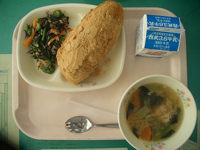 12月5日(火)の給食☆本日の献立☆ 白ごまきなこあげパン、白菜と肉団子のスープ、ほうれん草とひじきのサラダ 献立には、黒ごまあげパンとありますが、食材の入荷の都合で白ごまに変更になりました。きなこたっぷりのあげパンは、子ども達の大好きなメニューの一つです。食べるのが大変ですが… |