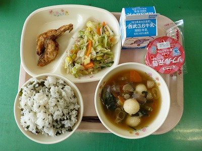10月2日(月)の給食☆本日の献立☆ わかめご飯、ハタハタの唐揚げ、野菜炒め、だまっこ鍋、ヨーグルト 本日は郷土料理特集でした。地域の特産物や珍しい料理が食べられるのも、給食の楽しみの一つです。 |