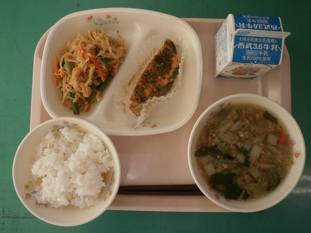 ☆今日の献立☆ 牛乳、ごはん、鮭のめんたいマヨネーズ焼き 切り干し大根の炒り煮、野菜のそぼろ汁