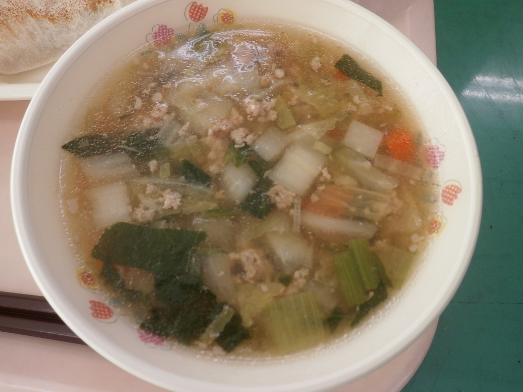 「野菜のそぼろ汁」は今月の新メニューです。 油で、しょうがと、長ねぎを焦がさないように炒め、 しょうが、しょうゆ、酒で下味をつけておいたひき肉を しっかり炒め、水、にんじん、大根、白菜、小松菜をいれ、 中華スープの素、チキンブイヨン、しょうゆ、塩、こしょうで味付け。 最後に水溶きのかたくり粉でとろみをつけました。