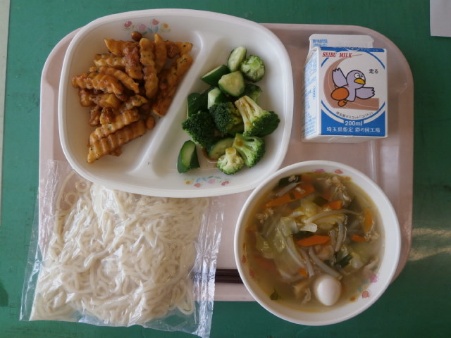 ☆今日の献立☆  ぎゅうにゅう 中華めん タンメンスープ 大豆とポテトの揚げ煮 温野菜(きゅうり、ブロッコリー) 今日は、暑かったので牛乳の残りがいつもより少なめでした。 野菜がどのクラスも空っぽで返ってきてびっくりしました。 暑くなってきたので、いっぱい食べて元気に過ごしてほしいです。 |