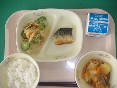 3月19日(月)の給食☆本日の献立☆ ご飯、サバの塩焼き、ジャガイモのそぼろ煮、胡麻酢和え サバの塩焼きが焼き加減も、味もとってもよかったです。ご飯のおかずにぴったりでした。 |