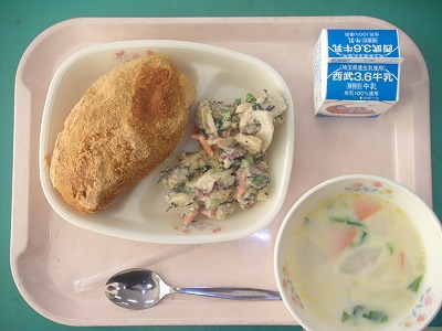 11月21日(火)の給食☆本日の献立☆ きなこあげパン、彩の国サラダ、カブの豆乳スープ 今日の給食は、何となく1品少ないような気がしますが、あげパンは結構ボリュームがあり、彩の国サラダは、さつまいもやレンコンがたくさん入っていて、食べ応えがありました。 |