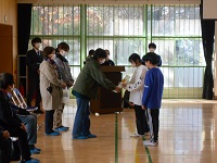 学区の民生委員さんをお招きし、これまでお世話をしたお花や、地域のお年寄りに渡す手紙を、5年生から民生委員の方々にお渡ししました。