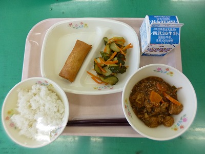 6月13日(月)の給食☆本日の献立☆ ご飯、ジャーチャンどうふ、春巻き、キュウリとにんじんのピリッと漬 中華料理の定食のようなメニューです。きっと子どもたちもご飯が進んだことと思います。 |