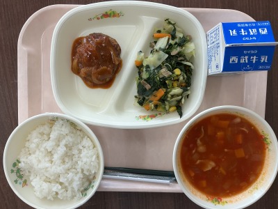 ハンバーグ・ほうれん草とコーンのソテー・ミネストローネ