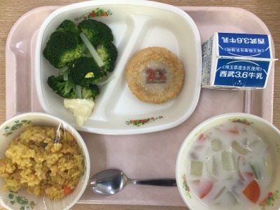 18年1月1日、1市3町の合併により新たな「深谷市」が誕生し、令和811日、新市誕生から20年という節目を迎えます。この節目に併せて、学校給食を通して、児童・生徒の食への関心を高めるとともに、20周年の思い出づくりに役立ててもらうため、市誕生20周年のお祝いとして、本日記念コロッケを学校給食で提供されました。また、本日使用しているブロッコリーは『ふかや園芸協会』から無償提供していただきました。