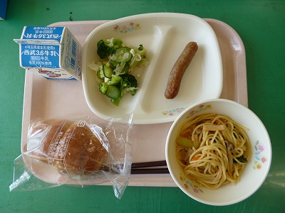 10月4日(火)の給食☆本日の献立☆ バターロール、森のキノコスパゲッティ、焼きウインナー、チーズサラダ 昨日は、6年生の親善運動会参加のため、ページの更新ができませんでした。 写真を見て、あ~食べたかったなぁと残念な気持ちです。 |