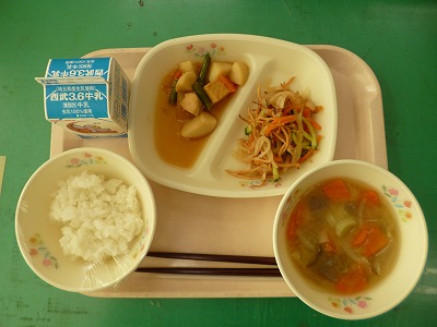 1月23日(月)の給食☆本日の給食☆ ご飯、鶏肉と里芋の煮物、かみかみ和え、野菜椀 かみかみ和え。するめの食感が楽しい献立です。 |