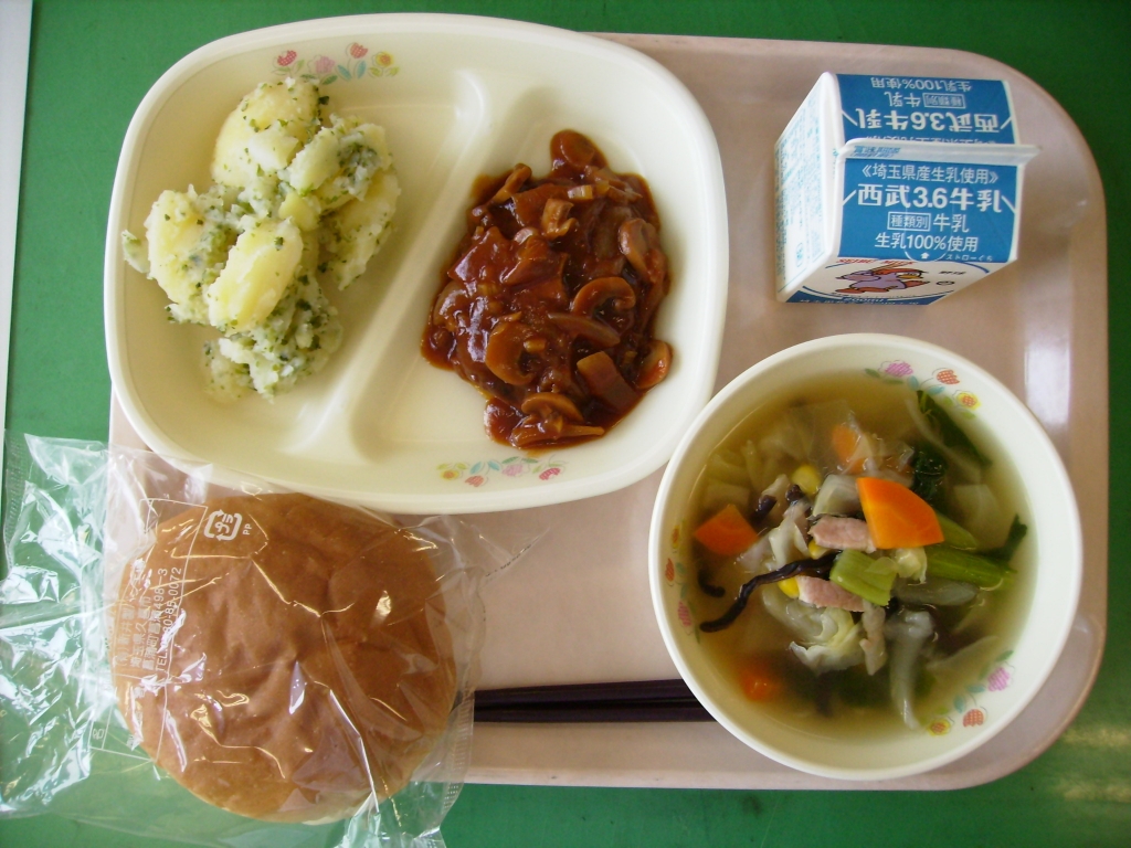 今日の献立  牛乳、子どもパンスライス、 ハンバーグデミグラスソース 粉ふきいも、野菜コンソメスープ 今日は粉ふきいもがおいしかったと、児童に好評でした。 じゃがいもを蒸してから、釜で水分を飛ばして、粉ふきいもにしました。