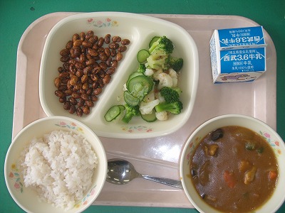 9月28日(木)の給食☆本日の献立☆ ご飯、夏野菜カレー、大豆のカリカリ揚げ、花野菜のサラダ 天候不順で野菜が高いと言われていますが、給食には毎日のように野菜が出ます。栄養バランスを考えてのことでしょう。今日も夏野菜と花野菜がたっぷり出ました。 |