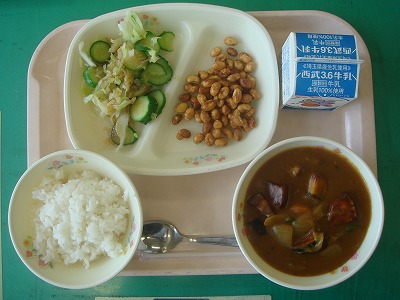 7月1日(金)の給食☆本日の献立☆ ご飯、夏野菜カレー、大豆のかりかり揚げ、キュウリとブロッコリーのドレッシング 夏野菜がたっぷり入ったカレー。おいしくて、ヘルシーです。ご家庭でもいかがですか? |