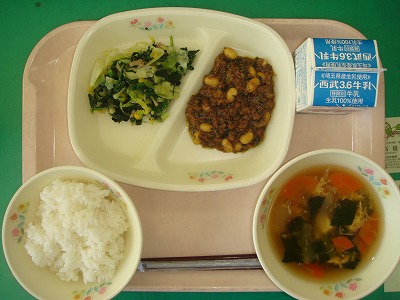 2月17日(金)の給食☆本日の献立☆ ご飯、ソイ丼の具、ほうれん草とコーンのソテー、かき玉汁 ちょっとピリ辛のソイ丼の具を載せたソイ丼。高学年の子どもたちは、ご飯をたっぷりよそってもらってから食べていたようです。 |