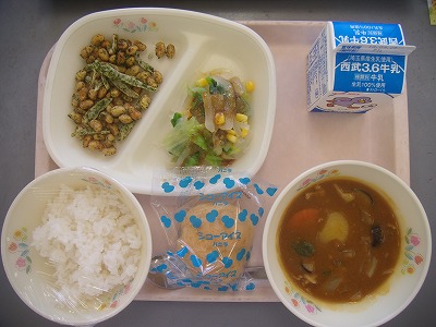 9月28日(金)の給食☆本日の献立☆ ご飯、野菜カレー、大豆とゴボウのカリカリ揚げ、ドレッシング和え、シューアイス カレーにアイス!子どもたちは大喜びです。久しぶりの青空で、気温も上がっているので、アイスも特別においしいことでしょう。 |