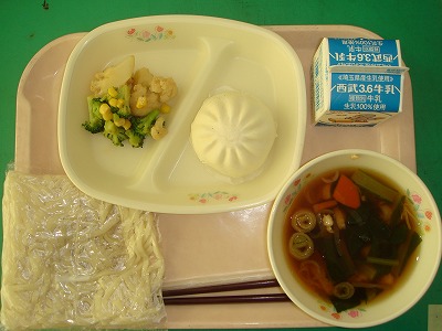 11月18日(金)の給食☆本日の献立☆ うどん、山菜うどんの汁、花野菜のサラダ、肉まん 花野菜のサラダには、榛沢名物ブロッコリーとカリフラワーが入っていました。それらを花野菜というのでしょうね。 |