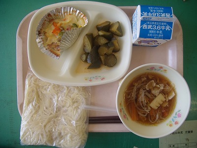 9月19日(水)の給食☆本日の献立☆ ラーメン、広東麺の汁、中華キュウリ、カラフルポテト、チーズ カラフルポテトは、その名のとおり、色々な具材が入っていて、見た目も楽しめました。 |