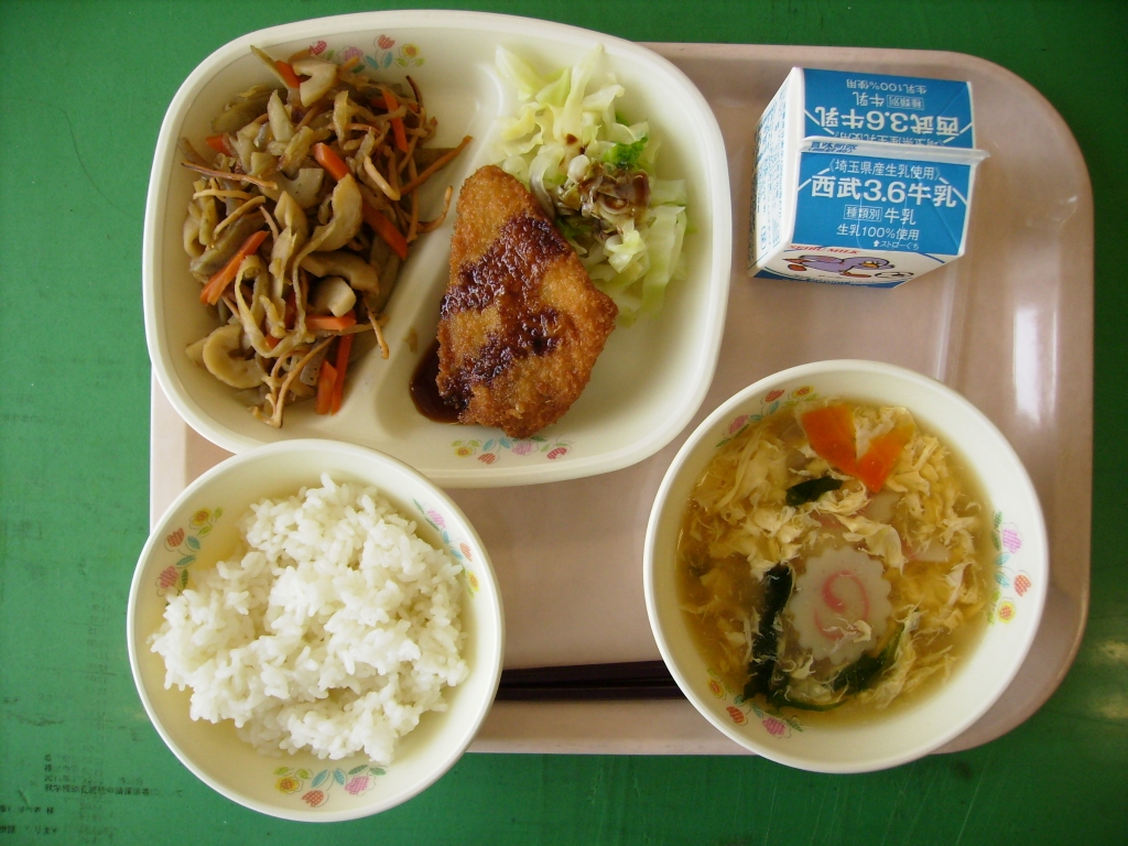 牛乳、ごはん、アジフィーレフライ、ゆでキャベツ かみかみきんぴら、かき玉汁