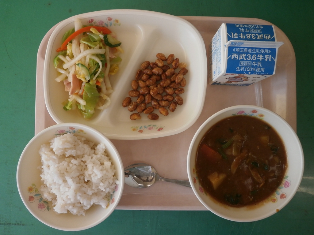 今日は2月最後の給食でした。 冬野菜カレーは、れんこんとごぼうを素揚げしてカレーに 入りました。水分が抜けて、甘みが引き立っていました。 ハムと大根のサラダは大根のほか、キャベツ、きゅうり、 彩りににんじんが入りました。彩りのきれいなサラダに 仕上がりました。子どもたちもよく食べていました。 カリカリの大豆は、カレーの相棒です。 今日は、砂糖と、塩で味付けをしました。