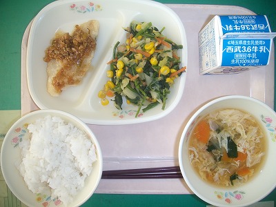 12月11日(月)の給食☆本日の献立☆ ご飯、白身魚の南蛮漬け、ほうれん草とコーンのソテー、かき玉汁 白身魚は、鱈(たら)。さかなへんに雪と書くように、12月から1月が旬だそうです。脂ののった鱈とネギたっぷりの甘辛のたれが、絶妙な味でした。 |