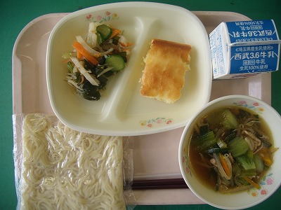 4月26日(水)の給食☆本日の献立☆ 中華麺、もやしラーメンスープ、マーマレードパンケーキ、大根とじゃこのサラダ 今日は、春とは言っても、日が陰ると少々肌寒い日でした。温かいラーメンがうれしかったです。手作りパンケーキもふんわりしていて、おいしかったです。 |