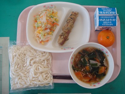 7月5日(火)の給食☆今日の献立☆ 地粉うどん、肉うどん、ウインナーの香味揚げ、たくあんサラダ、冷凍ミカン 今日は、温かいうどんはうれしいのですが、冷凍ミカンはできればもっと暑い日に食べたかったですね。献立予定ですので仕方がありませんが… |