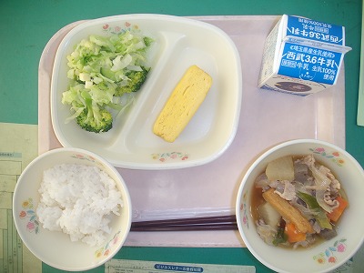 1月10日(木)の給食☆本日の献立☆ ご飯、大根と豚肉の煮込み、厚焼き卵、チーズサラダ 冬に不足しがちな野菜がたっぷりの献立でした。煮込みも、できたて熱々で、味もしっかり染みていて、ご飯のおかずにちょうどよかったです。 |