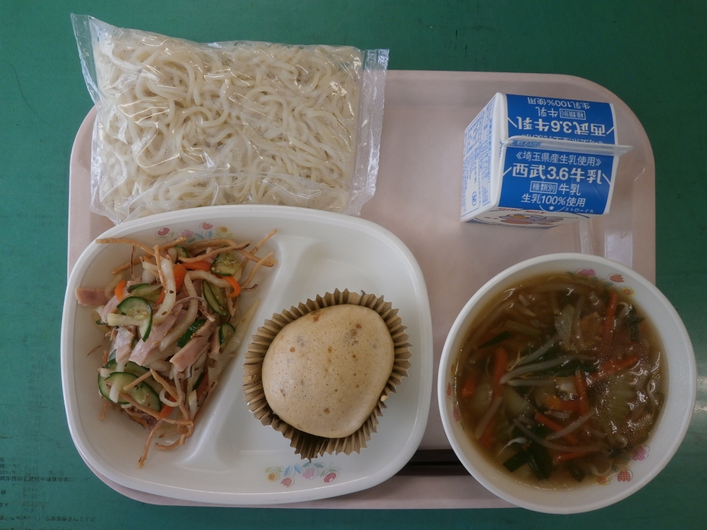 ラーメンのスープは、少しとろみのついたもやしたっぷりの もやしラーメン。どのクラスもきれいになって返ってきました。 マーラーカオは、中国風の蒸しパンで「南方の、マレーシアからの」 などの意味があるそうです。給食では、ホットケーキミックスを使い 卵、牛乳、サラダ油、黒砂糖、砂糖、しょうゆを混ぜ合わせて アルミカップに流し入れ、蒸しました。
