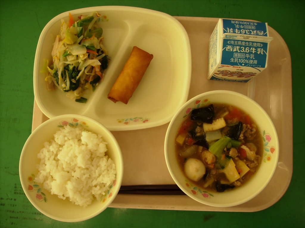 牛乳、ごはん、八宝菜、春巻き 深谷ねぎのナムル