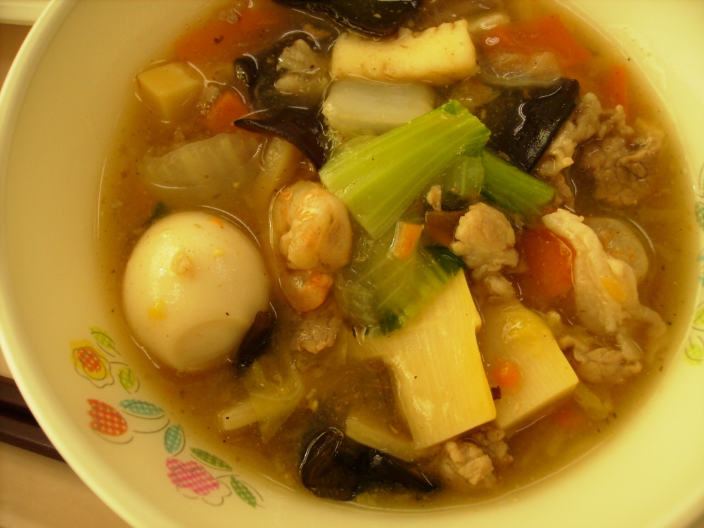 今日はにんじん、玉ねぎ、たけのこ、白菜 きくらげ、豚肉、うずら卵、えび、イカ、チンゲン菜と 野菜がたっぷり入った八宝菜でした。 ご飯にかけて食べて中華丼にして食べた児童もいました。