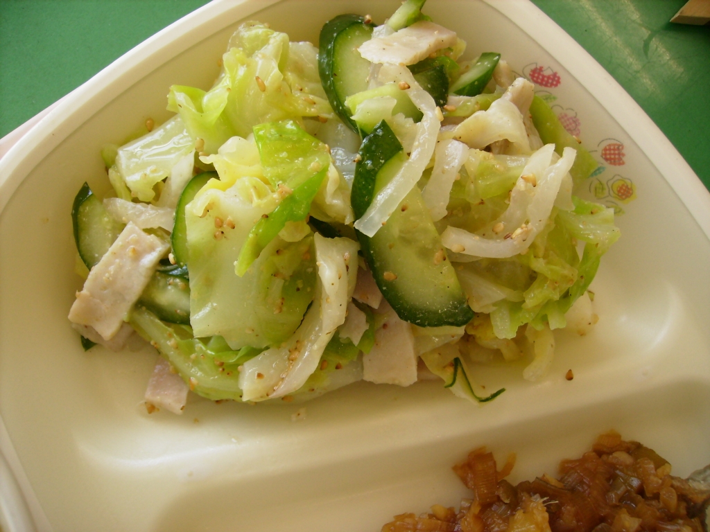 たくあん、キャベツ、きゅうり、ハムを手作りの