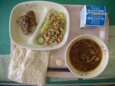 5月16日(水)の給食☆本日の献立☆ 地粉うどん、カレーうどんの汁、ちくわの煎茶揚げ、ヘルシーサラダ、チーズ カレーうどんは、服を汚さないように食べるのが難しいですね。子ども達はエプロンを着けているから、服は汚れませんが、エプロンが…おいしいので、つい勢いよくずるずるっといってしまいます。 |