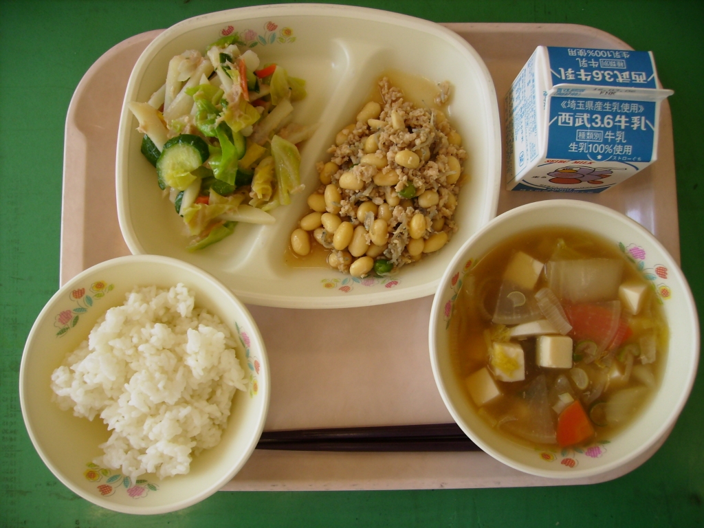 牛乳、ごはん、大豆の油味噌煮 ツナと野菜のミックスサラダ、吉野汁
