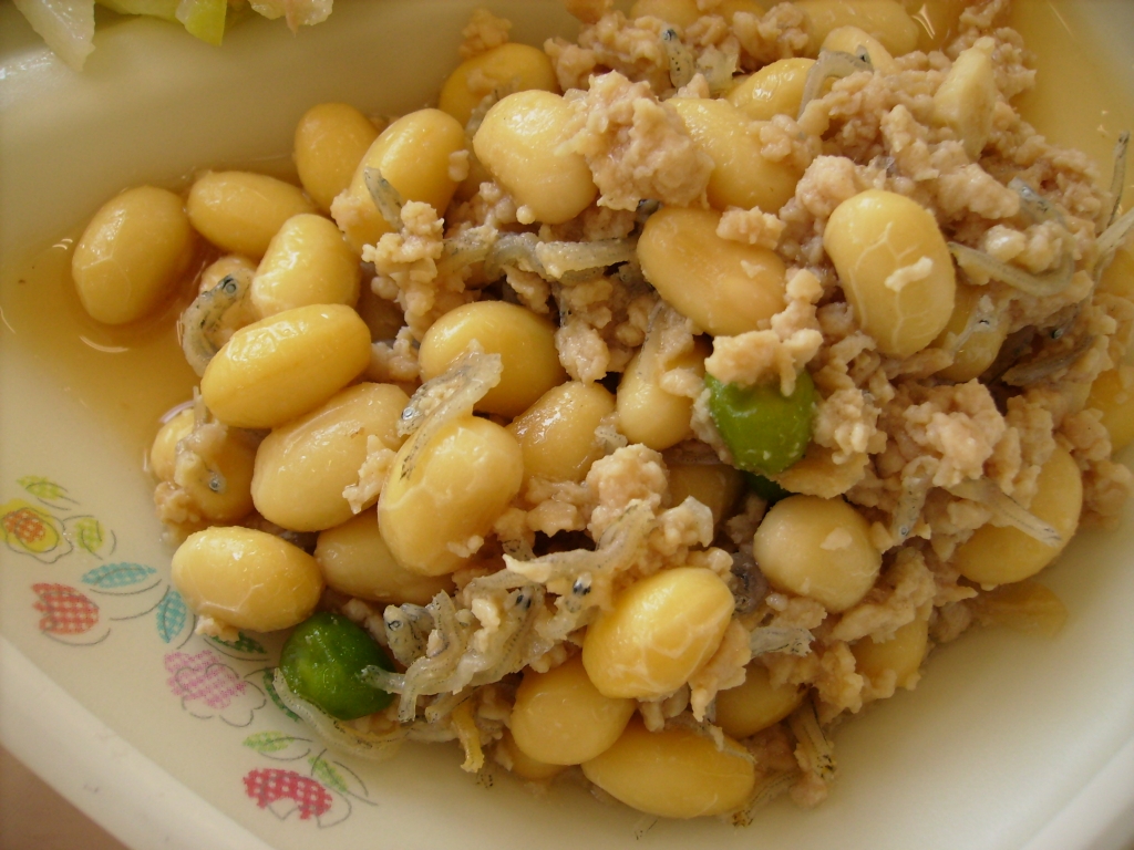 今日は大豆の油味噌煮は新メニューでした。 大豆と鶏のひき肉を味噌、砂糖、しょうゆ、みりんで 味付けをして、から煎りしておいたじゃこを最後に加えました。