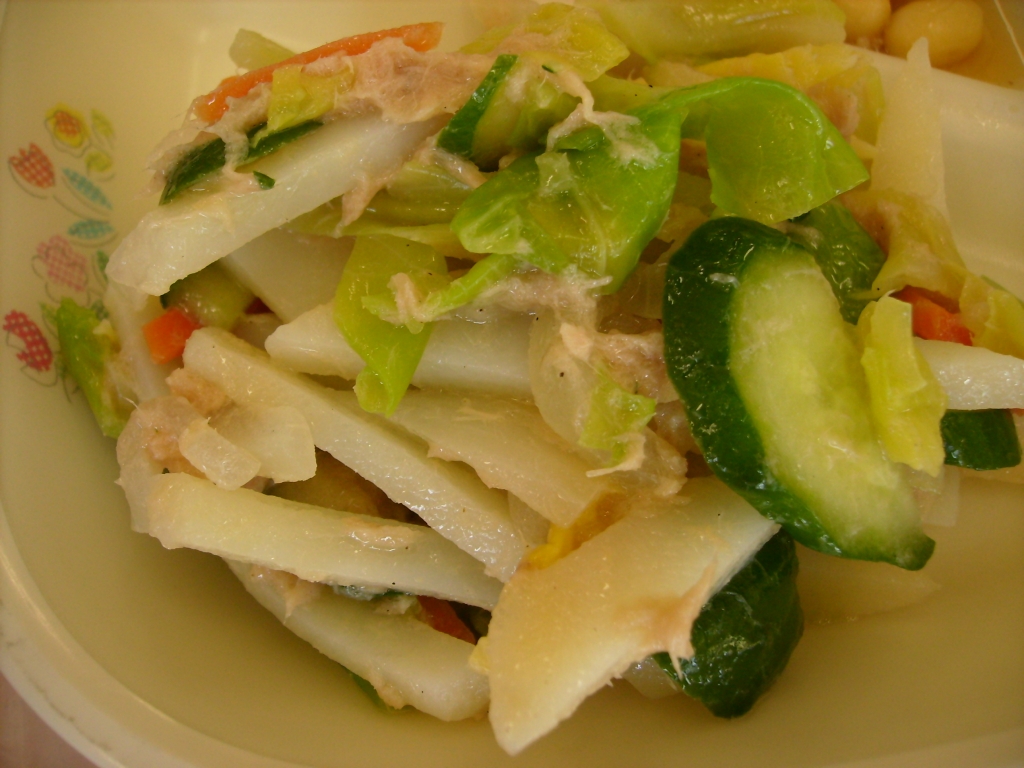 みんな、そぼろごはんにして食べたようです。 でも、今日の一番人気はサラダでした。 さっぱりした手作りドレッシングで、千切りにして さっと茹でてシャキシャキ感をのこしたじゃがいも、 にんじん、キャベツ、きゅうり、玉ねぎ、ツナと みじん切りにしたパセリを和えました。 どのクラスも空っぽになって戻ってきました。