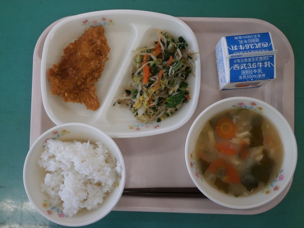 ☆今日の献立☆ 牛乳、ごはん、カレー風味カツ (カツ丼) 磯の香(いそのか)和え、みそ汁