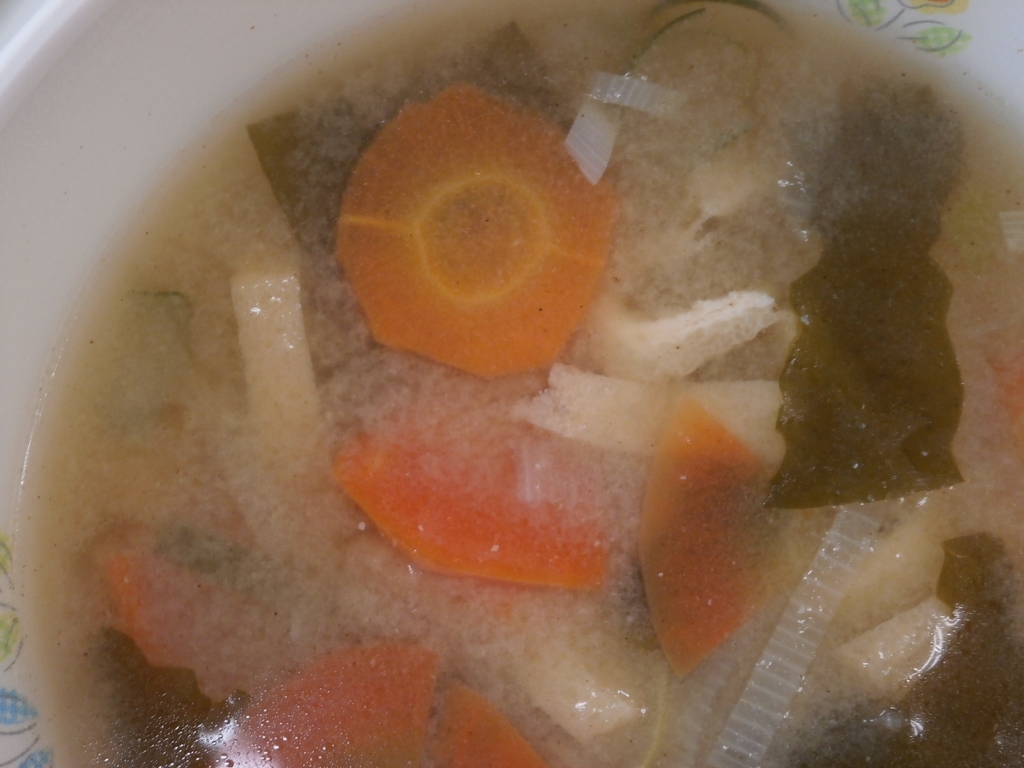 磯の香和えは、ほうれん草、もやし、キャベツ、にんじん かつお節、じゃこ、のりが入り、こちらも人気のメニューです。 みそ汁には、学校の畑のにんじんが入りました。 わかりやすいように、輪切りにしてみました。