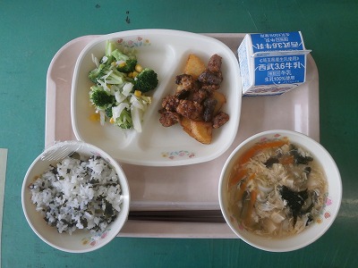 6月6日(月)の給食☆本日の献立☆ わかめご飯、豚肉の香味揚げ、三色サラダ、五目スープ 香味揚げには、レバーも入っていますが、このように味付けをすると食べられる子も多くなりそうですね。 |