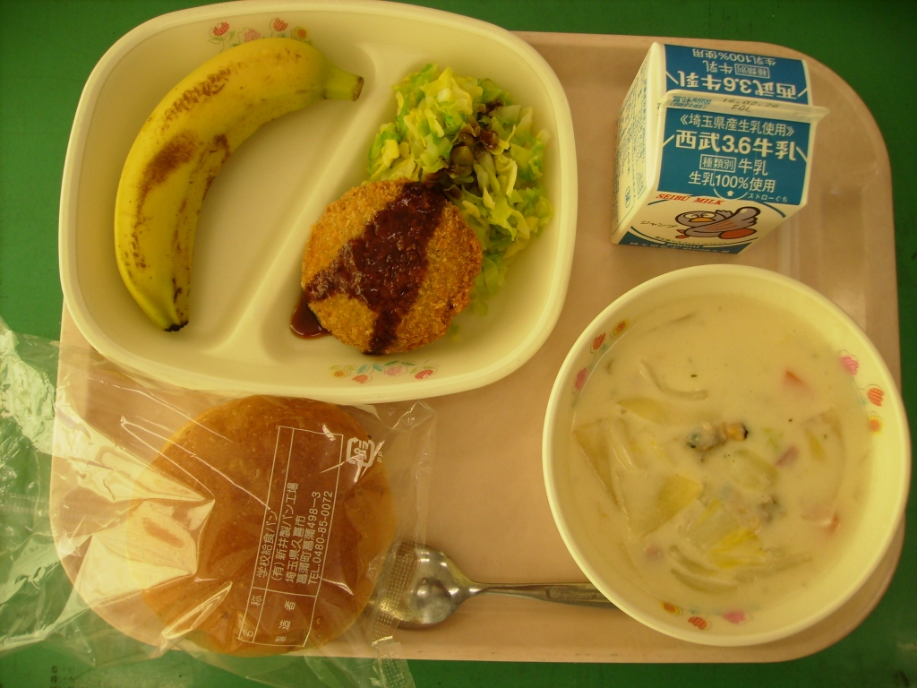 牛乳、豆乳セサミバーンズ、レバー入りメンチカツ ゆでキャベツ、クラムチャウダー、バナナ1/2