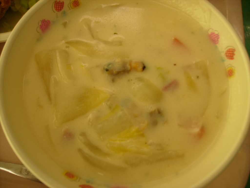 今日はパンにキャベツ、メンチを挟んで メンチカツバーガーにして食べました。 クラムチャウダーも児童に好評でした。