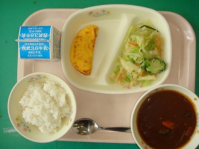 2月23日(木)の給食☆本日の献立☆ ご飯、ハヤシライス、オムレツ、グリーンサラダ サラダにも、ハヤシライスにも榛沢ブランドのブロッコリーが入っていました。緑が入ると見た目もきれいですね。 |