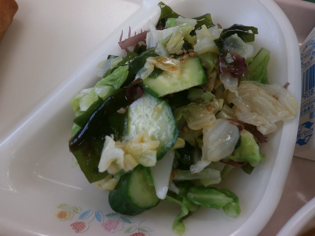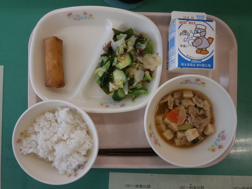 ☆今日の献立☆  牛乳 ごはん 肉豆腐 春巻き 海草サラダ 今日はカラフルな海草が入ったサラダでした。 サラダには海草のほか、キャベツときゅうりが入りました。 今日は少し気温が低かったけど、湿度が高くなってきたので、 冷たいサラダがおいしく感じるようです。 今日のサラダの残りはほんの1人分だけでした。