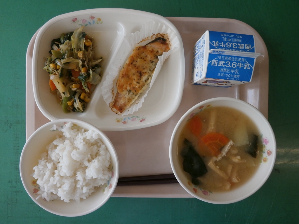 ☆今日の献立☆  牛乳、ごはん、みそ汁、小松菜とじゃこの炒り煮 鮭のマヨネーズ焼き 今日は自校給食になってから初めて残りゼロでした。 鮭のマヨネーズ焼きがご飯にあっておいしかったと言われました。 鮭の切り身に、マヨネーズ、塩、こしょう、白ワインで作ったソースをかけ、 とろけるチーズ、パセリをふってオーブンで焼きました。 魚の料理で残りがないなんてすごいです!!