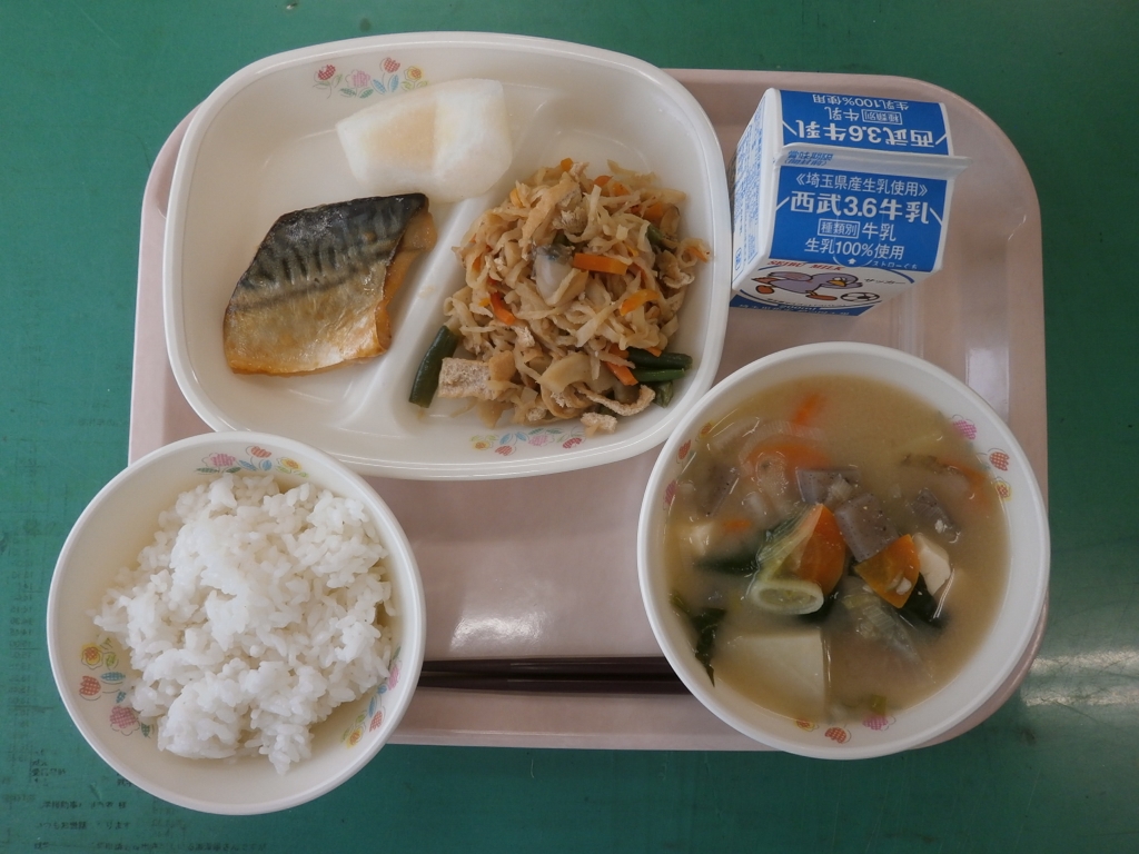 ごはん、牛乳、野菜椀、サバの西京焼き 切り干し大根の炒り煮、なし