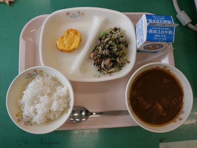 4月28日(木)の給食☆今日の献立☆ ご飯(ハヤシライス)、ツナとひじきのサラダ、ハートオムレツ、ハヤシシチュー |
