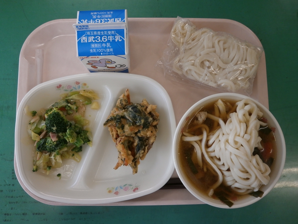 ☆今日の献立☆ 牛乳、肉うどん、ほうれん草のかき揚げ ブロッコリーとねぎのナムル