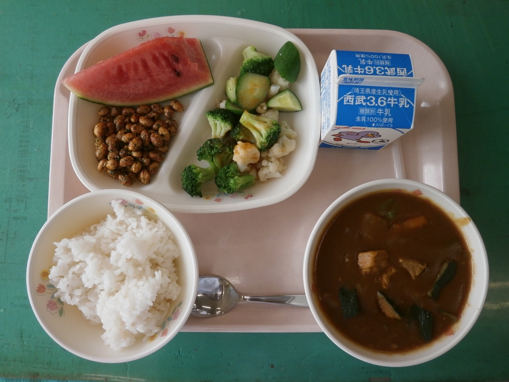 ☆今日の献立☆  牛乳、夏野菜カレーライス、大豆のカリカリ揚げ 花野菜サラダ、スイカ 今日は1学期の最後の給食でした。 メニューは旬の夏野菜がたっぷりは入ったカレーでした。 カボチャ、インゲン、なすが今日のカレーに入りました。 ほかの夏野菜、オクラ、トマト、ピーマンやズッキーニなども カレーとよく合います。チャレンジしてみて下さい。 スイカも甘く、よく冷えていておいしかったです。 子どもたちからは、「1学期の給食ごちそうさまでした」と うれしい言葉をかけてもらいました。 2学期もおいしい給食を提供できるようにがんばります。 |