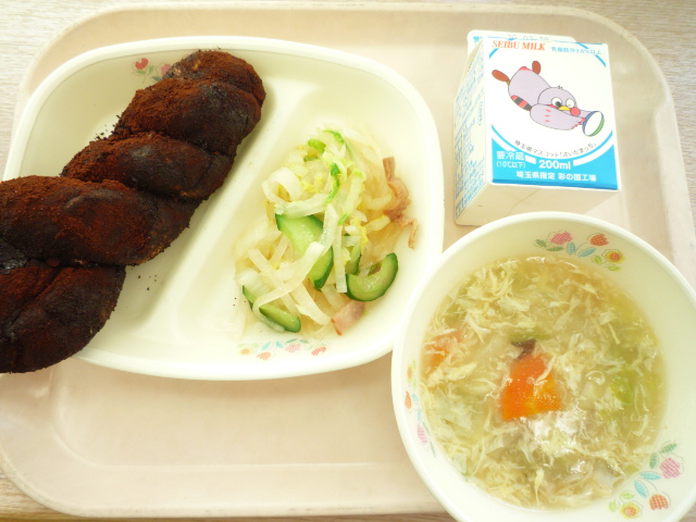 (献立) ココア揚げパン ハムと大根のサラダ ガタタン 牛乳 (コメント) ガタタンは北海道芦別の郷土料理です。 野菜や魚介類など具だくさんの中華風スープです。 とろみがあって美味しいです。おかわりしたいほどです。 ココア揚げパンの画像の色を実際の物に近づけるため 露出を変えて撮影しました。 |